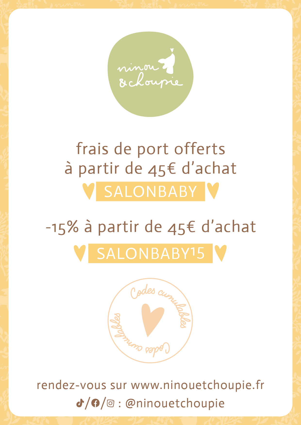 Suite au Salon Baby de Lyon le week-end dernier, Ninou et Choupie a décidé de prolonger l'offre jusqu'au lundi 6 avril minuit!