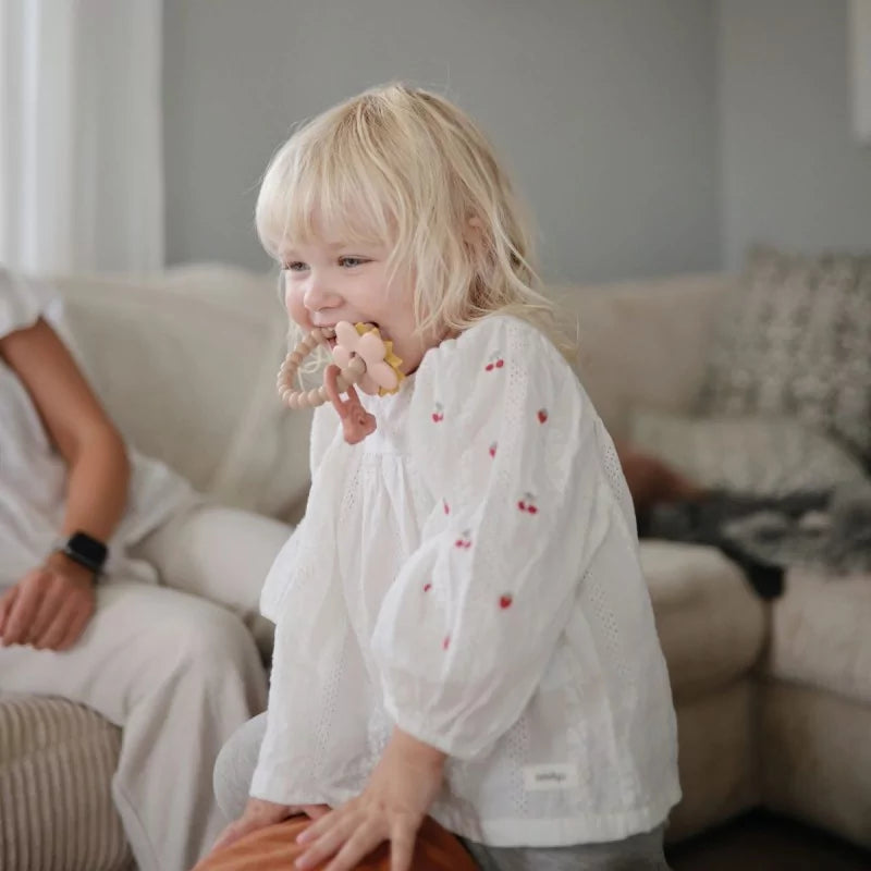 L'anneau de dentition présente différentes formes et textures qui stimulent les sens des enfants tout en apaisant leurs gencives dans le matériau en silicone doux à 100% de qualité alimentaire.