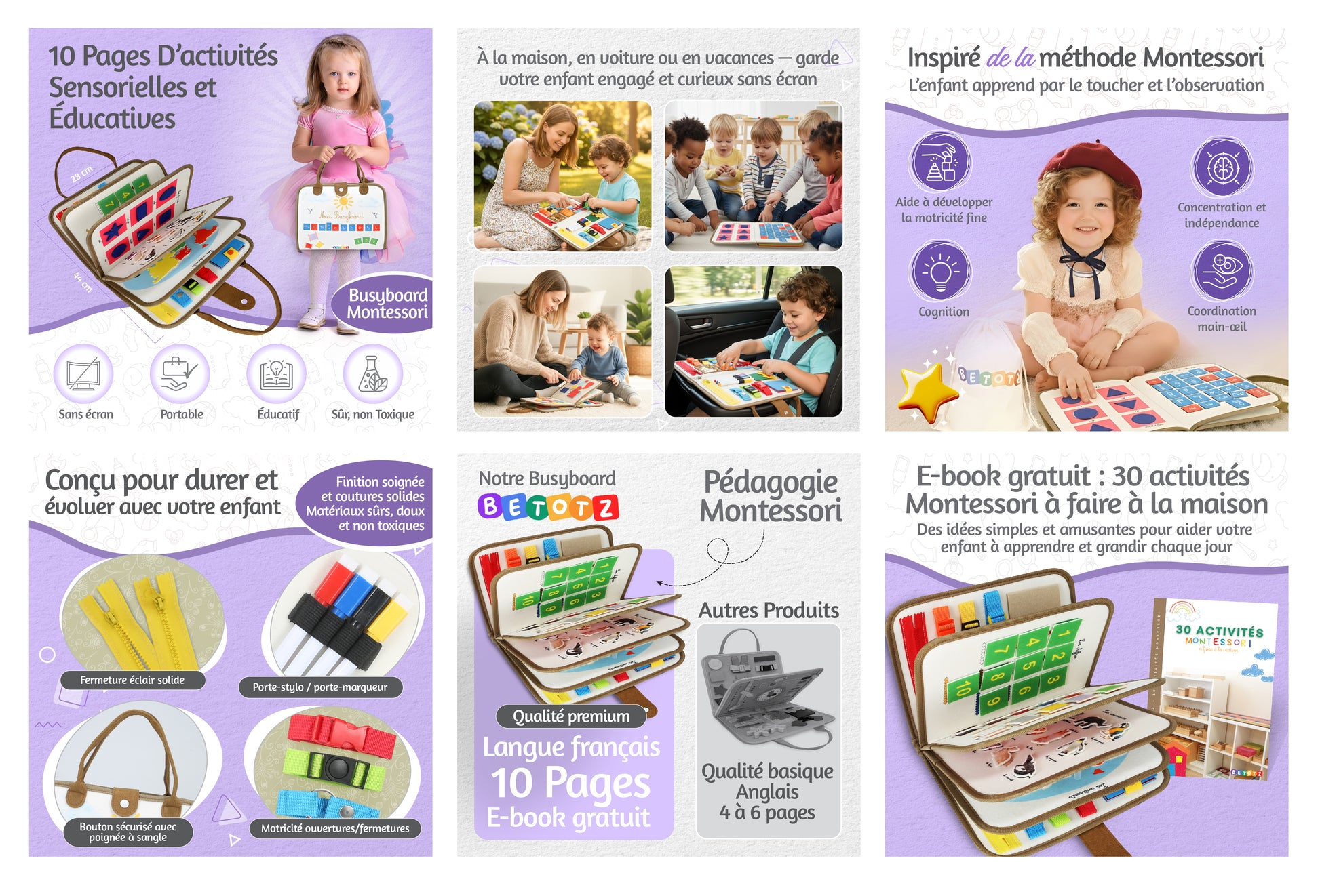 - 🍁 Respect de la pédagogie Montessori. Ce tableau d'activités suit la véritable approche Montessori : des activités auto-correctives, sensorielles et réalistes pour développer l'autonomie, la motricité et la concentration.