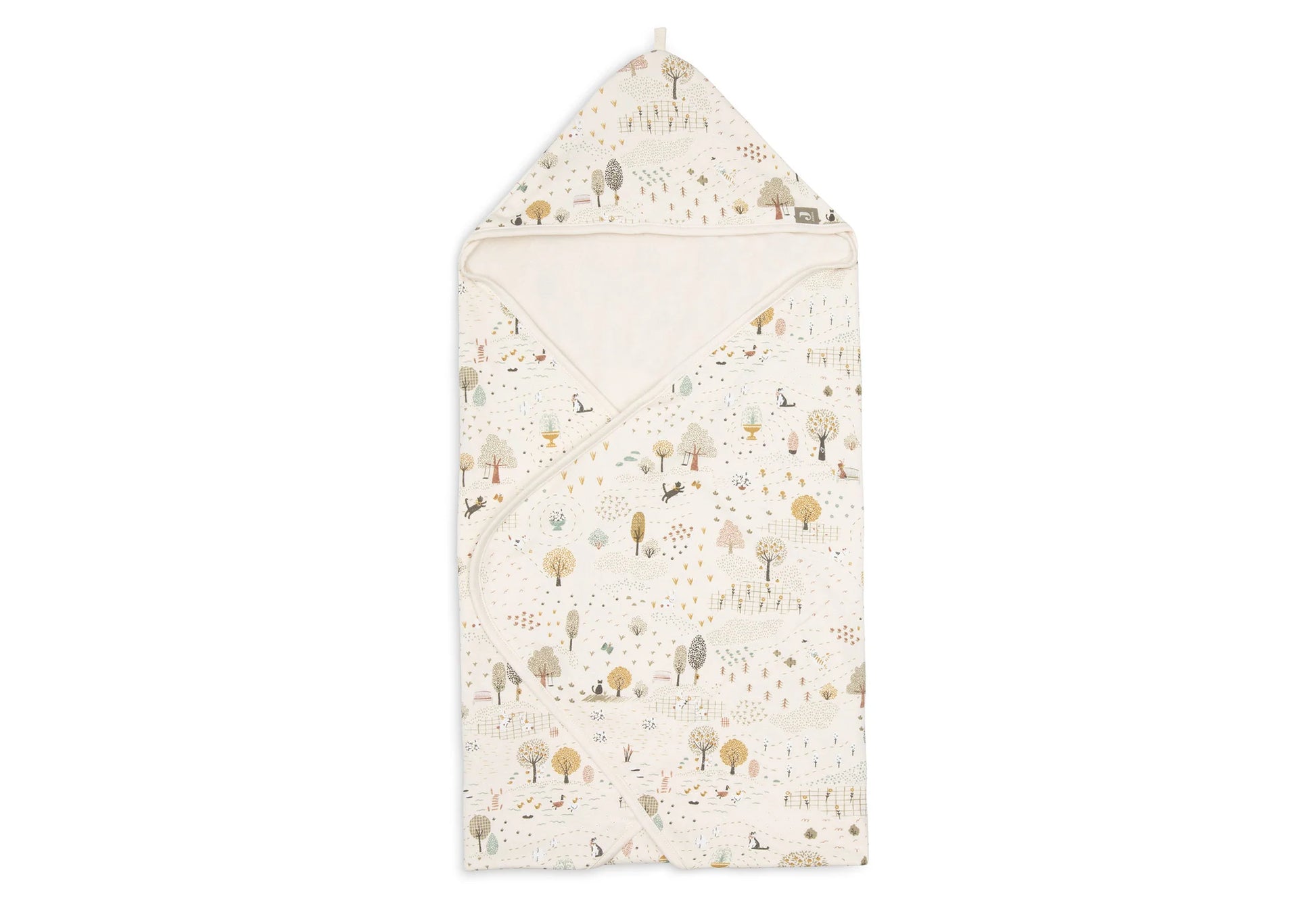 L’extérieur est en jersey doux avec un joli imprimé Tiny Park, et l’intérieur en éponge moelleuse couleur oatmeal assure un confort optimal.