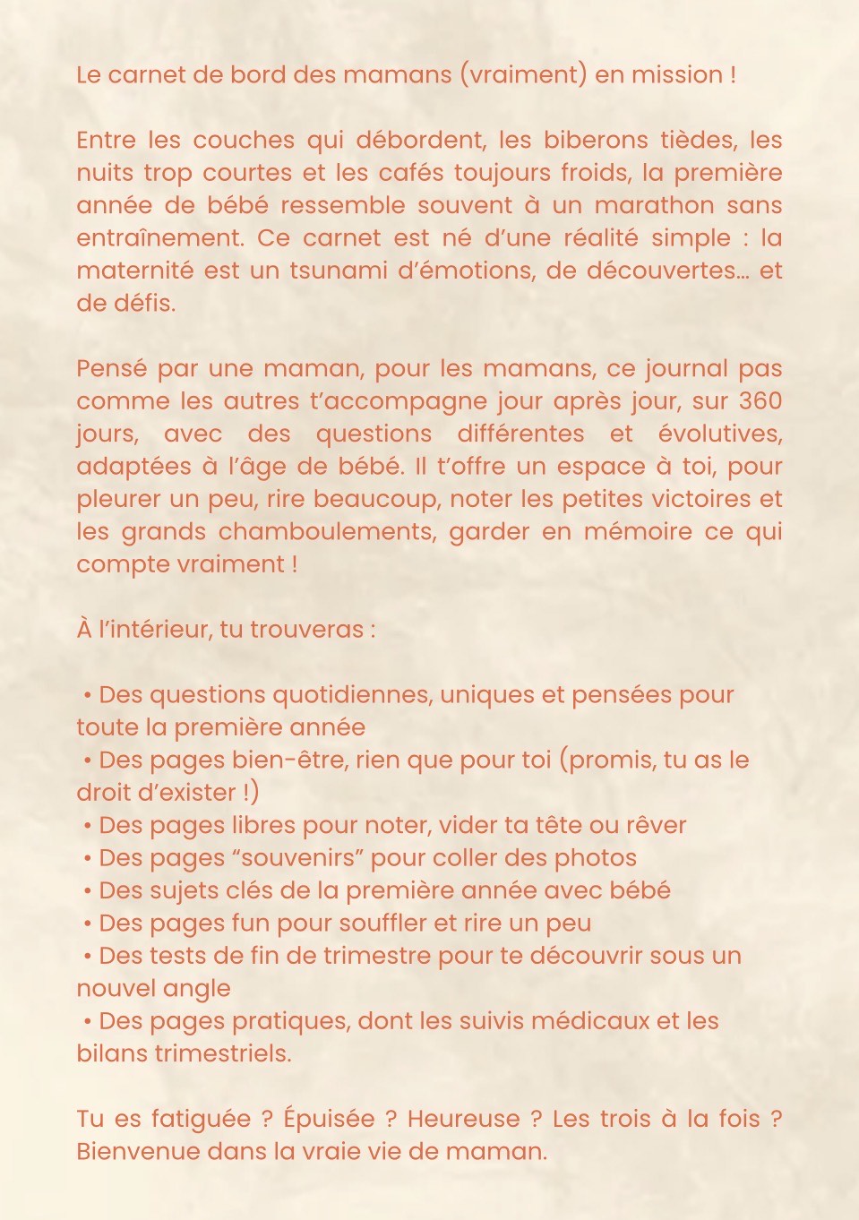 Épuisée, mais heureuse ! est un journal de bord de 307 pages pensé pour les mamans qui veulent garder des traces vraies et précieuses de la première année de leur bébé — sans pression, sans règles, et avec beaucoup de bienveillance.