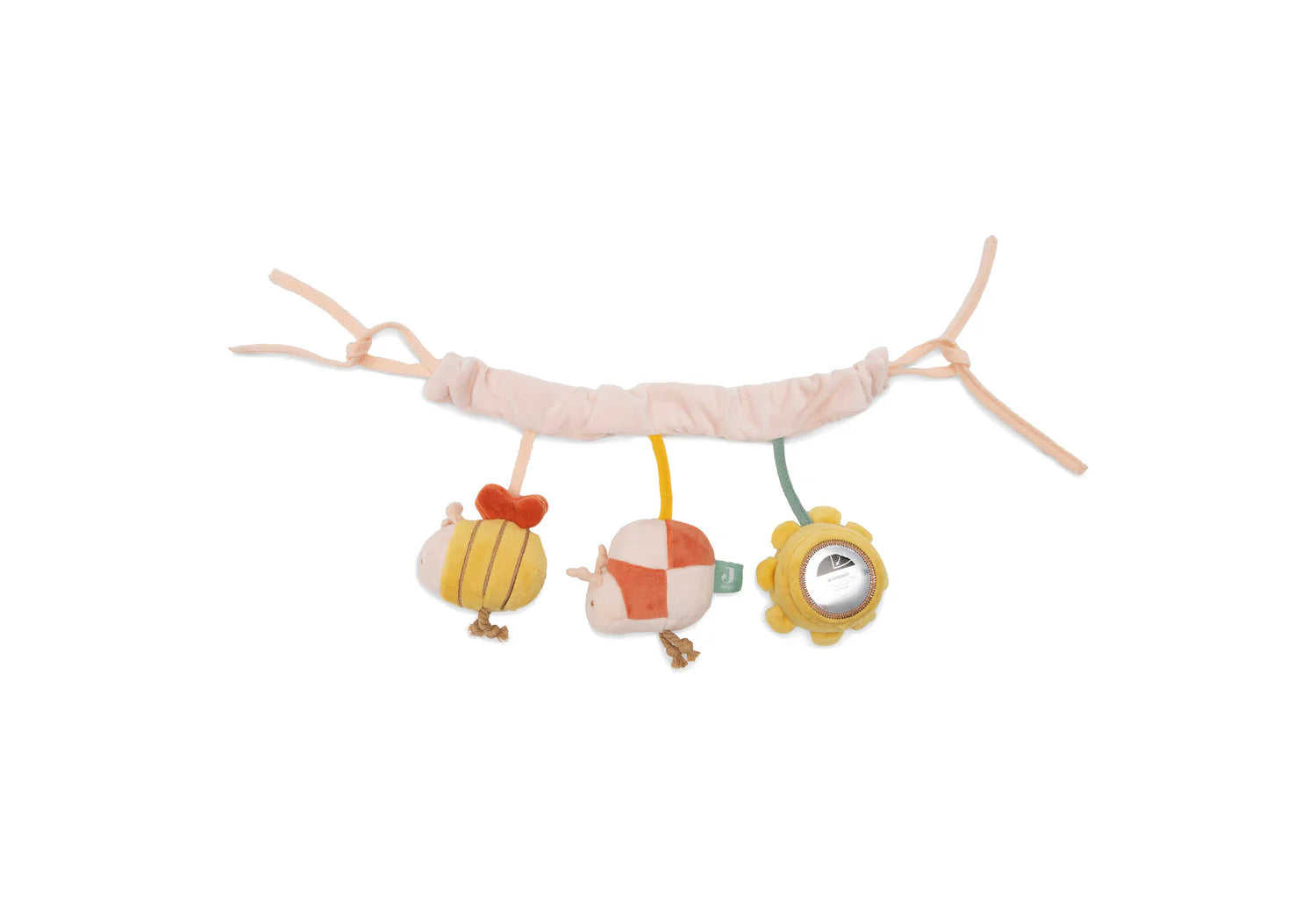 Le soleil est équipé d’un petit miroir pour que votre enfant puisse se découvrir, l’abeille produit un amusant bruit croustillant et la coccinelle contient une douce clochette.
