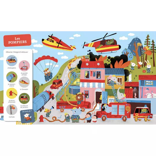 . Le livre présente 10 double pages avec des illustrations colorées et simples, avec 7 éléments à retrouver par page.