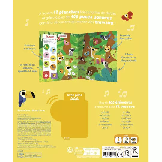 Dans ce nouveau cherche et trouve sonore, le tout-petit explore le monde des animaux à travers 12 planches foisonnantes de détails et près de 100 sons à découvrir !