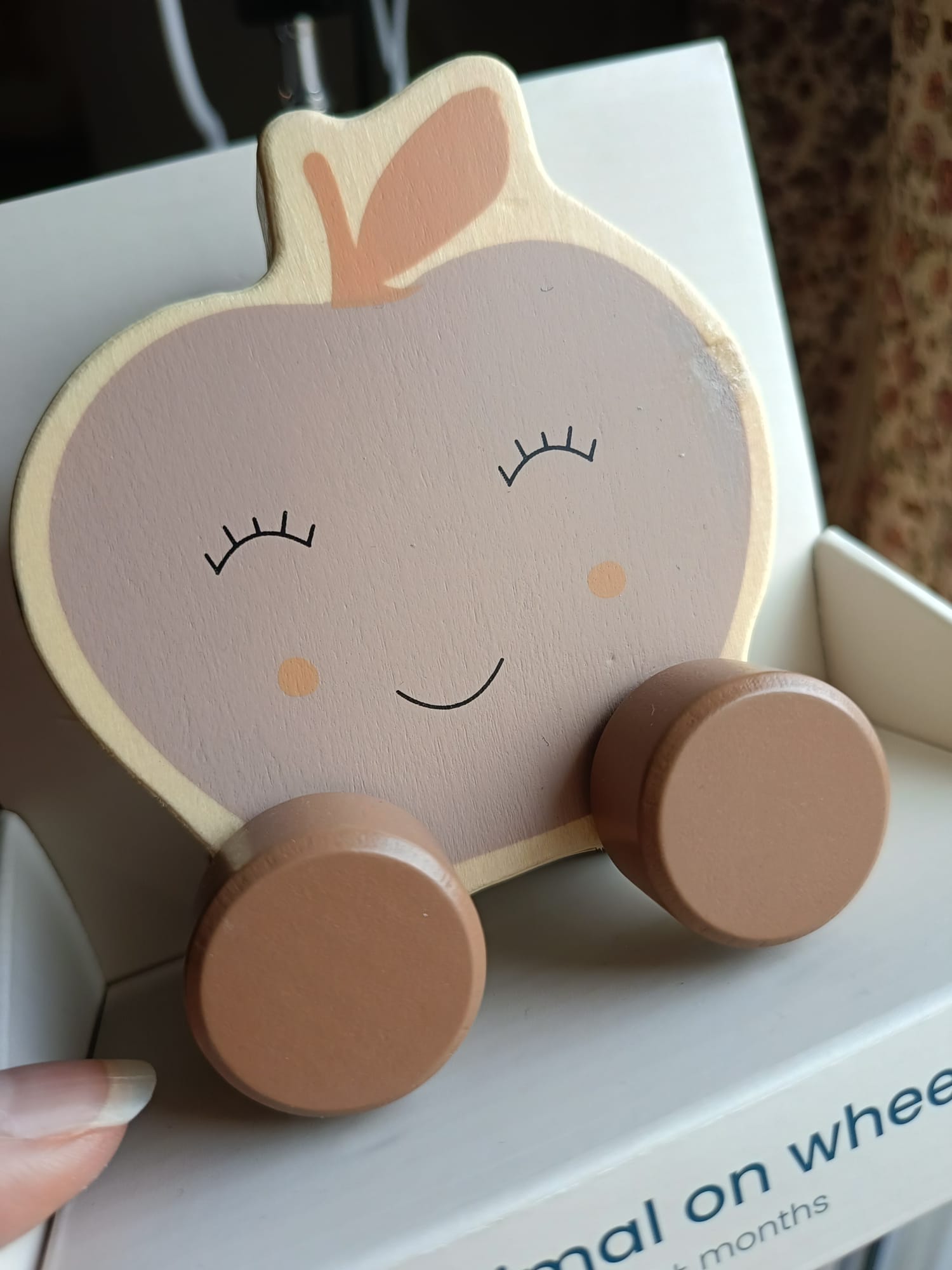 Jolie pomme à roulettes qui présente un défaut sur le devant à droite ainsi qu'une tâche du bois + foncé à gauche.