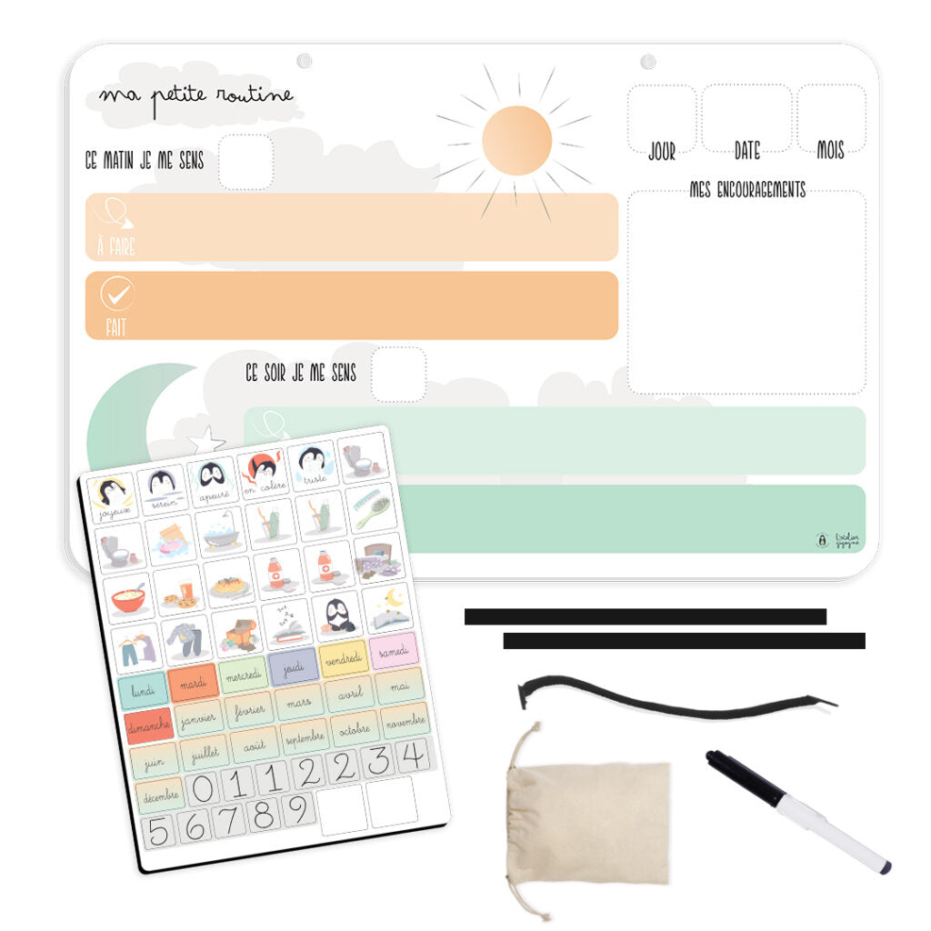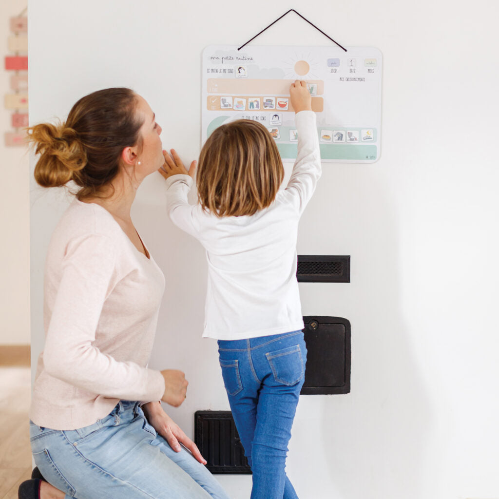 Sur le support magnétique, deux rangées permettent d’identifier facilement ce qui a déjà été fait et ce qu’il reste à faire. La bulle « mes encouragements » permet de soutenir l’enfant dans ses progrès et le motiver en valorisant ses réussites. Il dispose également de deux cases pour exprimer ce qu’il ressent : l’une pour le matin, l’autre pour le soir. Le but est de lui permettre de souligner les émotions et évènements positifs ou désamorcer des situations problématiques en début et fin de journée.