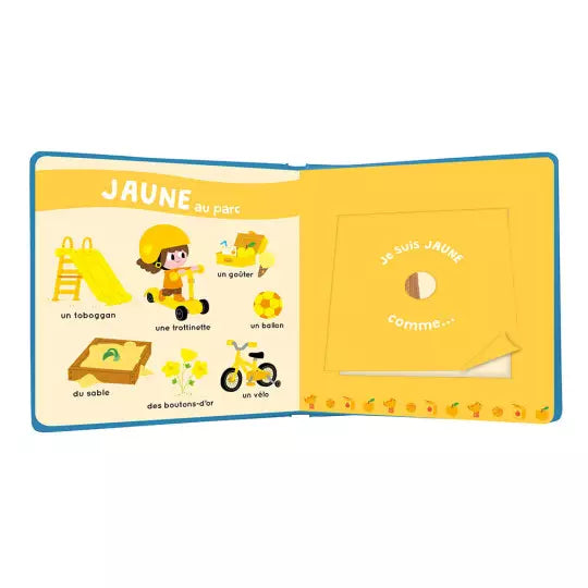 Une couleur, un imagier et une odeur par double-page, sur le thème de la journée. Du lever au coucher, de la petite école au parc, les odeurs apportent une dimension nouvelle .