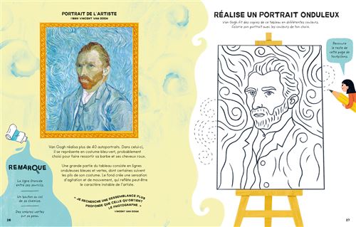 Découvre les œuvres de certains des artistes les plus célèbres du monde, accompagnées d'anecdotes insolites et d'éléments à repérer, puis dessine, gribouille et colorie ta propre version !