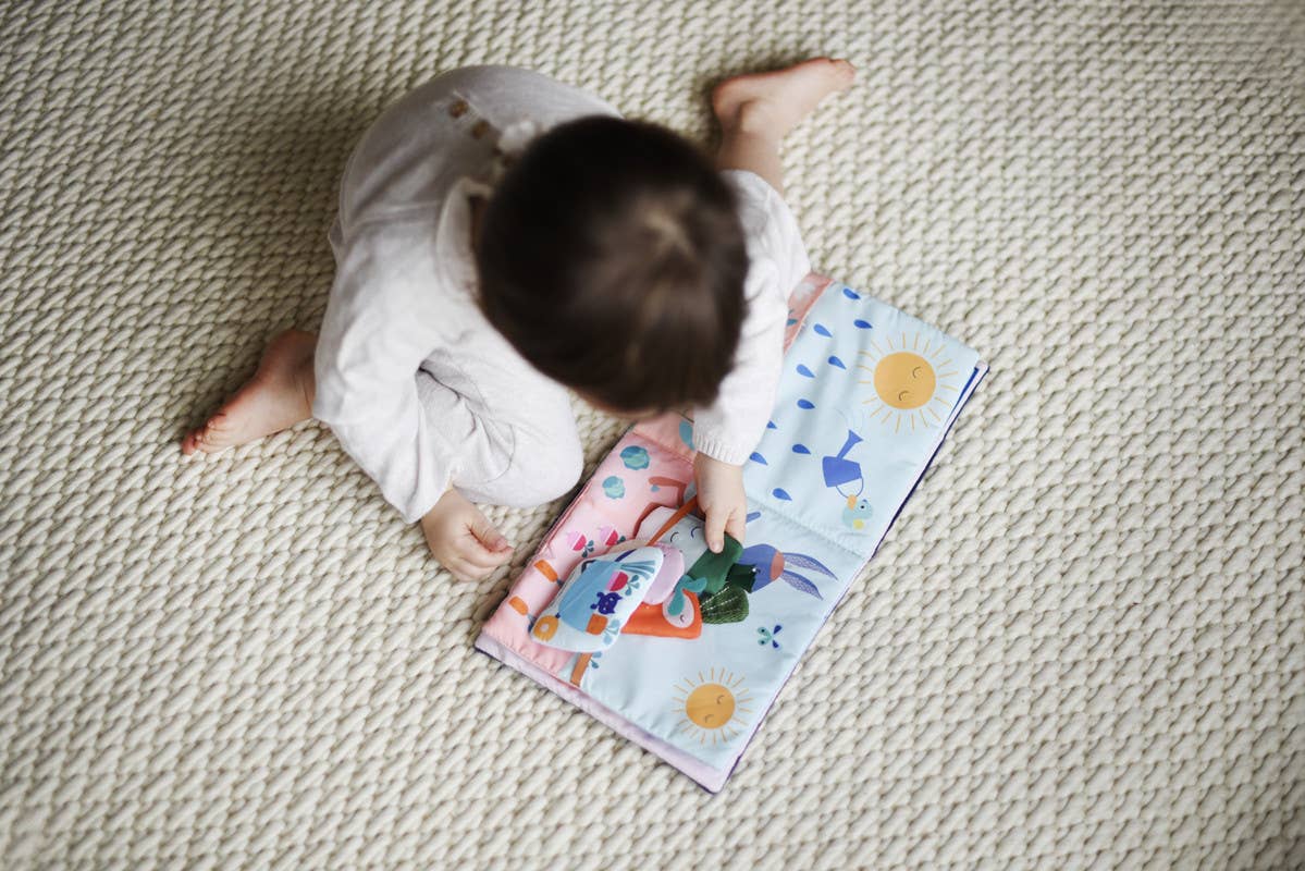Un grand livre de 8 pages avec à chaque page des activités d'éveil, du cache cache ... grelots; papier bruissant.