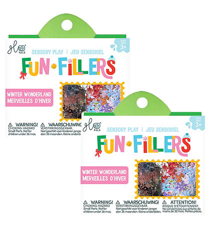 Pot sensoriel Funky Glo Pals avec lumières changeantes de couleur dans un coffret cadeau. Le bocal sensoriel a un design blanc et est livré avec deux paquets de confettis Fun Fillers (Winter Wonderland) et trois feuilles d’autocollants réutilisables.
