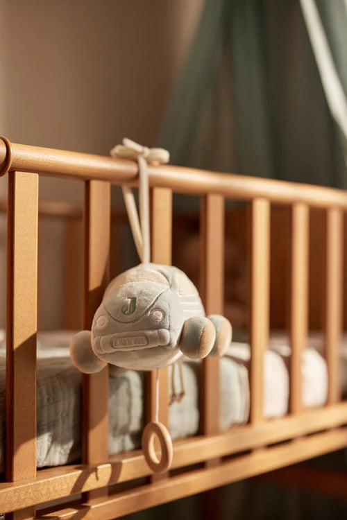 Faites rêver votre petit avec notre adorable mobile musical On the Go en forme de petite voiture. Cette douce voiture de couleur Sea Green est dotée de roues couleur biscuit et de fenêtres en tissu côtelé !