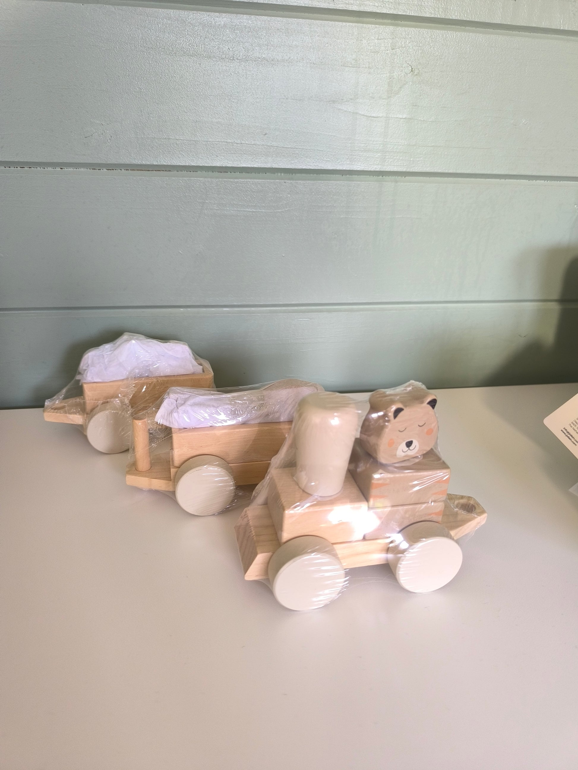 Les jouets sont de couleurs neutres et tous les articles sont fabriqués en bois 100% FSC. Très amusant comme cadeau de naissance ou toute autre occasion !